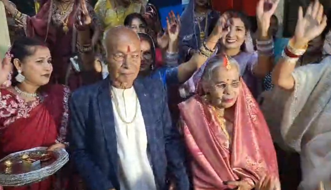 परपोता बना दूल्हे दादा का सारथी : इस आयोजन में खास बात ये थी कि बलदेव और बेचनी के बारात में उनका परपोता तनिष्क सर्राफ सारथी बना.इस दौरान गाड़ी में बैठाकर परदादा दूल्हा और परदादी दुल्हन को लेकर घर से शादी घर तक पहुंचा. आम तौर पर कम ही लोगों को ऐसा सौभाग्य मिलता है कि वो अपने परपोता के साथ इतना लंबा जीवन जी सके. लेकिन बलदेव और बेचनी अभी भी एकदम स्वस्थ है. परपोता अब 18 साल का हो चुका है. बुजुर्ग दंपत्ति अपने 18 साल के परपोते के साथ जीवन का आनंद ले रहे हैं.