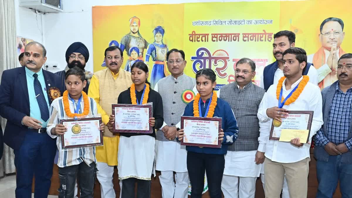 रायपुर: शुक्रवार की रात मुख्यमंत्री निवास में आयोजित ‘वीर बाल दिवस’ के विशेष समारोह में प्रदेश के चार बहादुर बच्चों को उनकी अदम्य वीरता और सूझबूझ के लिए मुख्यमंत्री विष्णुदेव साय ने सम्मानित किया. छत्तीसगढ़ सिविल सोसायटी द्वारा आयोजित इस कार्यक्रम में इन बच्चों को गुरु गोविंद सिंह के चारों साहिबजादों की स्मृति में स्थापित पुरस्कार दिए.