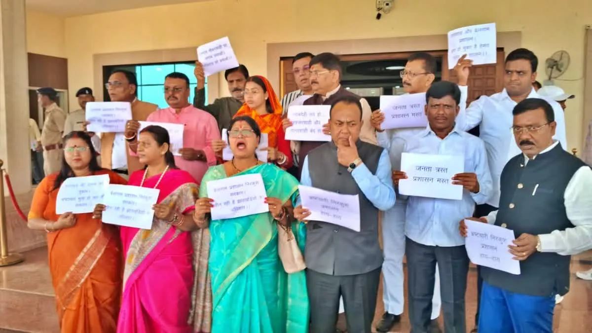 रांचीः बजट सत्र के 10वें दिन विपक्ष सरकार के खिलाफ आक्रामक होता दिखा. सदन की कार्यवाही शुरू होने से पहले भारतीय जनता पार्टी के विधायकों ने विधानसभा परिसर में जमकर नारेबाजी की. पार्टी के मुख्य सचेतक नवीन जायसवाल के नेतृत्व में प्रदर्शन कर रहे भाजपा विधायकों ने राज्य में अफसरशाही के कारण आम लोगों को हो रही परेशानी की ओर ध्यान खींचा.